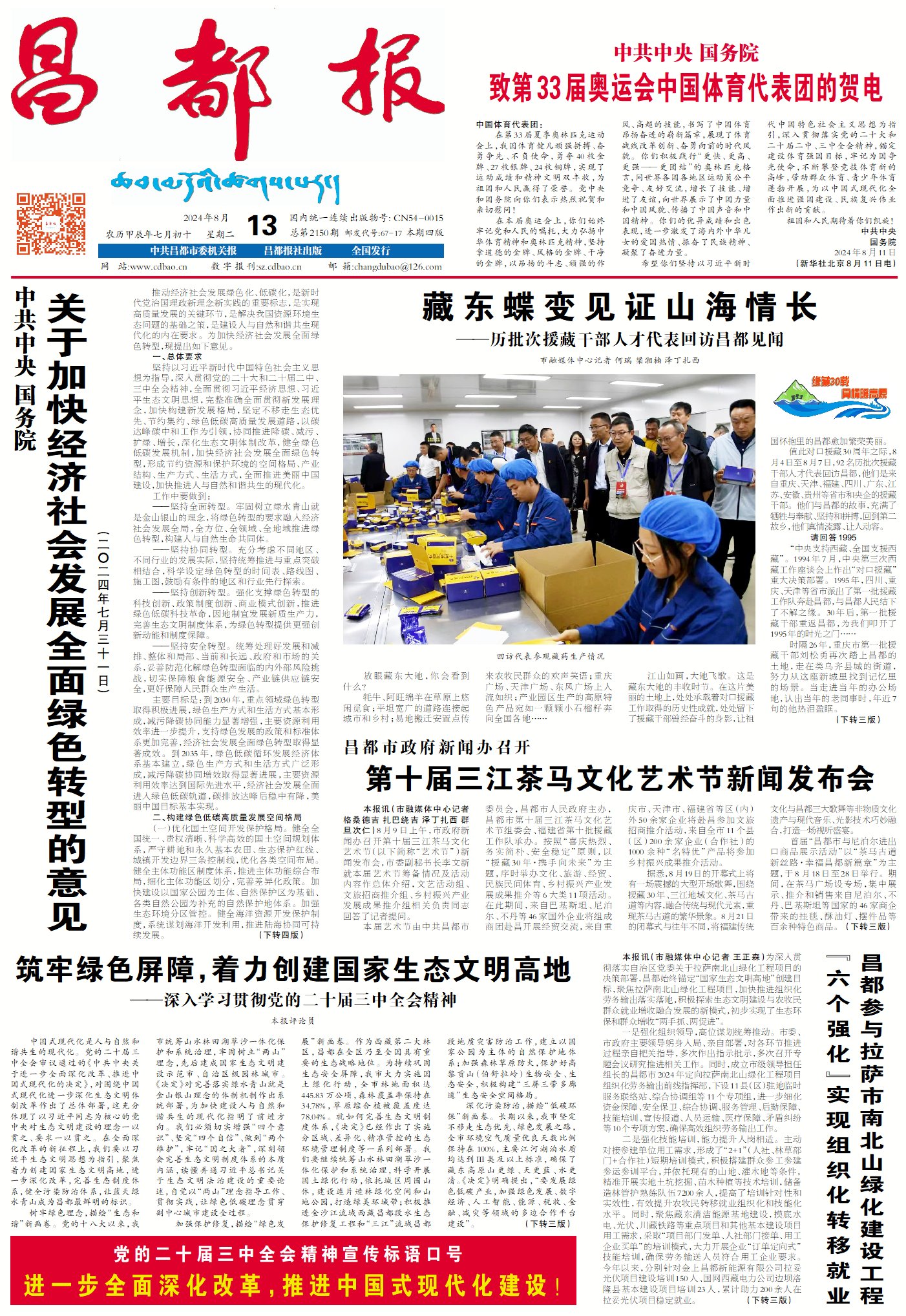 深化污染防治,描繪“低碳環保”新畫卷。長期以來,我市堅定不移走生態優先、綠色發展之路,全市環境空氣質量優良天數比例保持在100%,主要江河湖泊水質均達到Ш類及以上標準,確保了藏東高原山更綠、天更藍、水更清。《決定》明確提出,“要發展綠色低碳產業,加強綠色發展、數字經濟、人工智能、能源、稅收、金融、減災等領域的多邊合作平臺建設”。我們要以此為契機,堅持精準治污、科學治污、依法治污,持續推進“3+4”產業綠色低碳高質量發展,探索建立凈零碳綠色產業園區,推廣綠色低碳生活方式,推進低碳社區、低碳家庭建設,持續打好藍天碧水凈土保衛戰。